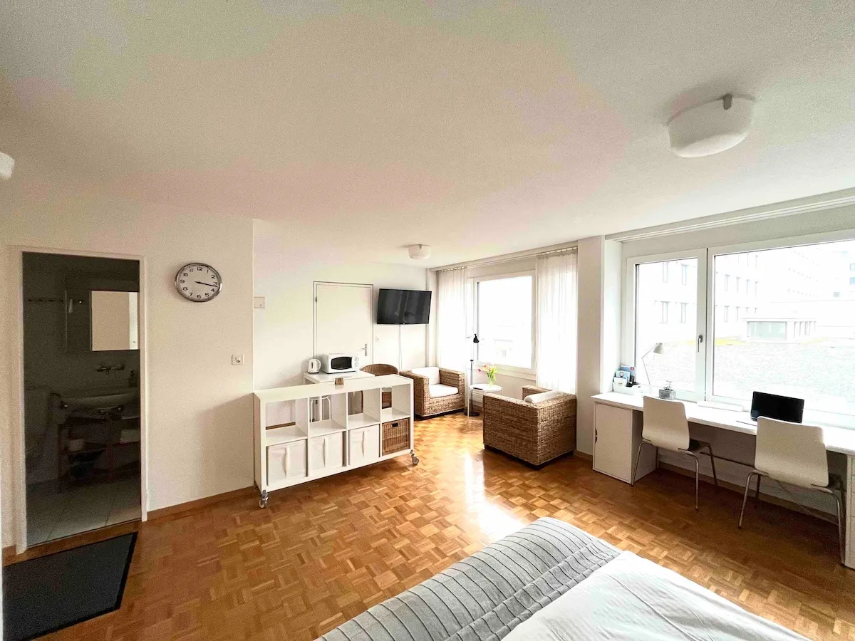 Alle unsere Apartments befinden sich an der Badenerstrasse 414 in 8004 Zürich. Jedes Apartment bietet eine voll ausgestattete Küche, ein eigenes Bad sowie einen komfortablen Wohnbereich mit Schreibtisch – ideal zum Arbeiten und Entspannen. Zur Ausstattung gehören außerdem ein Smart-TV, kostenloses WLAN und eine großzügige Arbeitsfläche. Die regelmäßige Reinigung ist im Preis inbegriffen, ebenso wie sämtliche Nebenkosten. Sie genießen höchsten Komfort mit maximaler Flexibilität – ob für kurze oder längere Aufenthalte.